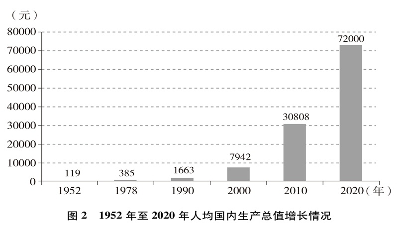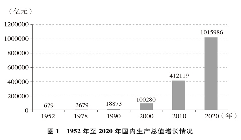 經(jīng)濟實力大幅提升。中國國內(nèi)生產(chǎn)總值從1952年的679.1億元躍升至2020年的101.6萬億元,經(jīng)濟總量占全球經(jīng)濟比重超過17%,穩(wěn)居世界第二大經(jīng)濟體(圖1)。人均國內(nèi)生產(chǎn)總值從1952年的幾十美元增至2020年的超過1萬美元,實現(xiàn)從低收入國家到中等偏上收入國家的歷史性跨越(圖2)。制造業(yè)增加值多年位居世界首位,220多種工業(yè)產(chǎn)品產(chǎn)量居世界第一,自2010年起連續(xù)11年位居世界第一制造業(yè)大國。中國已是全球貨物貿(mào)易第一大國、服務(wù)貿(mào)易第二大國、商品消費第二大國、外匯儲備第一大國,2020年利用外資居全球第一。不斷邁向共同富裕的14億多人口,其中有超過4億并不斷擴大的中等收入群體,是全球最具成長性的超大規(guī)模市場,中國經(jīng)濟充滿活力,具有巨大潛力和充足后勁。2020年,中國率先控制新冠肺炎疫情,率先復(fù)工復(fù)產(chǎn),率先實現(xiàn)經(jīng)濟增長由負(fù)轉(zhuǎn)正,充分彰顯中國經(jīng)濟的強勁韌性。