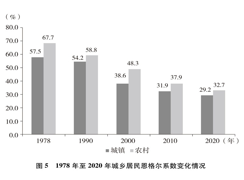 人民生活水平顯著提高。居民收入持續(xù)增加,全國居民人均年可支配收入從1978年的171元增加到2020年的32189元(圖4)。城鄉(xiāng)居民恩格爾系數(shù)分別從1978年的57.5%、67.7%下降到2020年的29.2%、32.7%(圖5),城鄉(xiāng)居民生活質(zhì)量不斷提升。溫飽問題解決后,人們對生活品質(zhì)、品位有了更高的追求,衣食住行不斷升級,消費結(jié)構(gòu)從生存型逐漸向發(fā)展型、享受型過渡。衣,從穿暖到穿美、穿出時尚;食,從吃飽到吃好、吃出健康;住,從有所居到更敞亮、更宜居;行,從便利通暢到快捷舒適。吃穿用有余,家電全面普及,乘用汽車快速進(jìn)入尋常百姓家。餐飲、健康、教育、旅游、文娛等服務(wù)性消費持續(xù)快速增長,在居民人均消費支出中占比逐漸達(dá)到一半左右。越來越多的人有“錢”有“閑”,“詩和遠(yuǎn)方”更加觸手可及,“說走就走”不再是夢想,旅游扮靚人們的幸福生活,中國正在進(jìn)入大眾旅游時代。