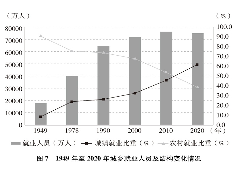 就業(yè)局勢長期穩(wěn)定,就業(yè)質(zhì)量顯著提升。就業(yè)人數(shù)從1949年的1.8億增加到2020年的7.5億,就業(yè)規(guī)模不斷擴大;從絕大多數(shù)勞動者以農(nóng)業(yè)為生到第三產(chǎn)業(yè)就業(yè)人數(shù)占47.7%(圖6)、城鎮(zhèn)就業(yè)人數(shù)占61.6%(圖7),就業(yè)結(jié)構(gòu)不斷優(yōu)化;從勞動者普遍處于文盲半文盲狀態(tài)到勞動年齡人口平均受教育年限10.8年、技能人才總量約2億,就業(yè)人員素質(zhì)大幅提高。億萬勞動者擁有自己熱愛的工作,開啟幸福生活的大門。從計劃分配到市場就業(yè)、自由擇業(yè)、自主創(chuàng)業(yè),從傳統(tǒng)就業(yè)方式到新就業(yè)形態(tài),勞動者的就業(yè)觀念深刻變革、就業(yè)空間更加廣闊、就業(yè)方式日益多元。人們的興趣愛好、特長稟賦與個人就業(yè)意愿、社會需求、國家需要更好結(jié)合,自我價值更好實現(xiàn),主動性創(chuàng)造性顯著增強,創(chuàng)新創(chuàng)造熱情不斷迸發(fā)。勞動者合法權(quán)益得到保障,勞動報酬保持增長,勞動所得受到保護(hù),人們越來越有尊嚴(yán)地勞動、快樂地勞動,依靠自己的雙手創(chuàng)造美好生活。從“單休制”到“雙休制”,從“黃金周”到帶薪年休假,勞動者休息休假權(quán)益越來越有保障,工作生活更加平衡。勞動最光榮、最崇高、最偉大、最美麗日益成為全社會的共識和行動,勤奮做事、勤勉為人、勤勞致富成為風(fēng)尚,崇尚勞動、尊重勞動、熱愛勞動的社會氛圍更加濃厚。